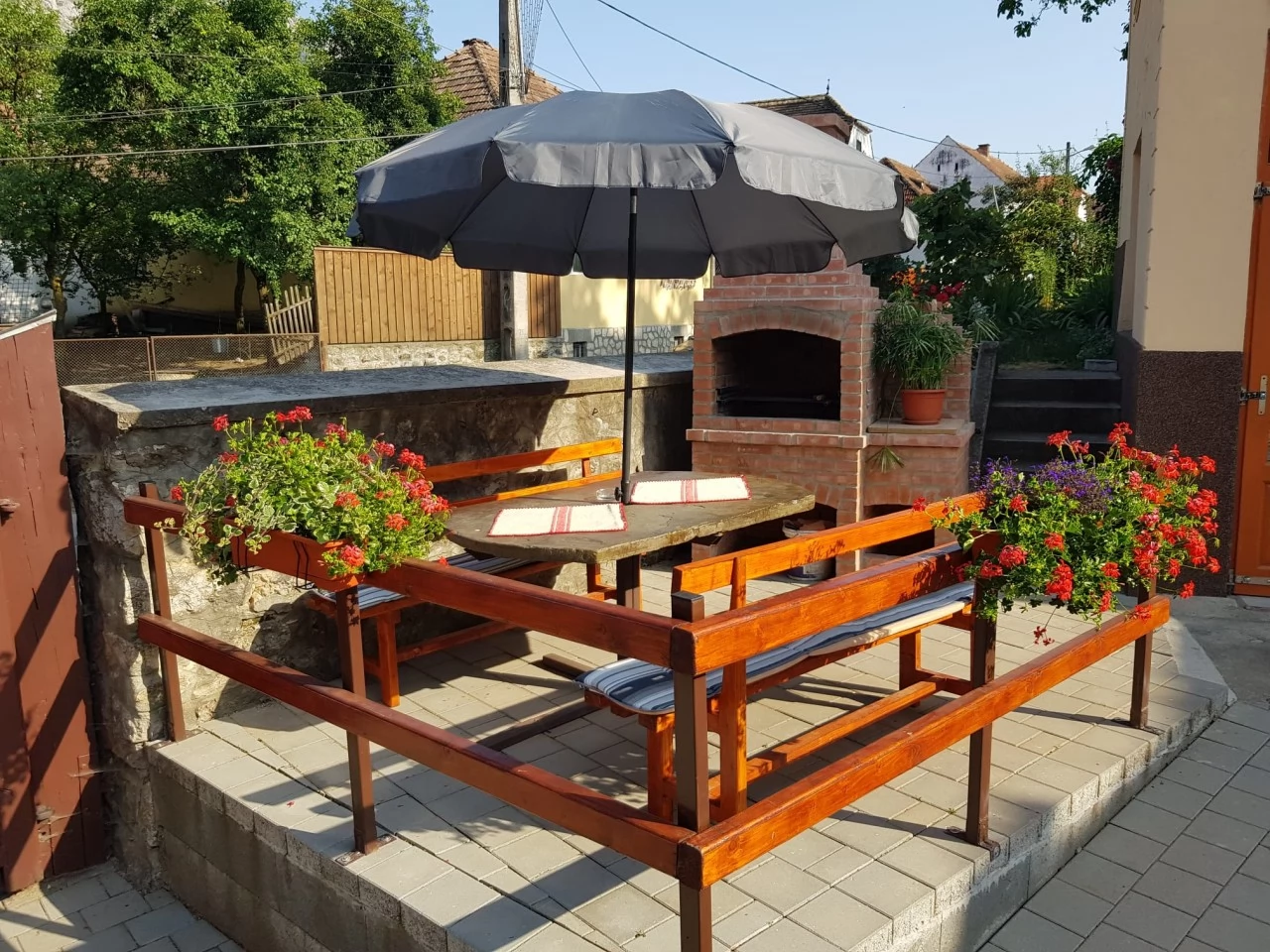 - Curtea amenajată a pensiunii și grădina dotată cu mobilier de grădină sunt locul pentru diverse programe de agrement la aer liber, unde există un foișor, un cuptor, un loc amenajat pentru grătar și ceaun, precum si o parcare spațioasă închisă.