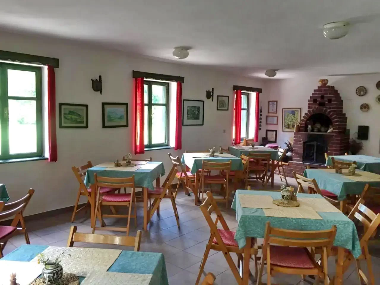 Mesele sunt servite într-o sală de mese rustică și primitoare, care funcționează și ca living pentru oaspeți.