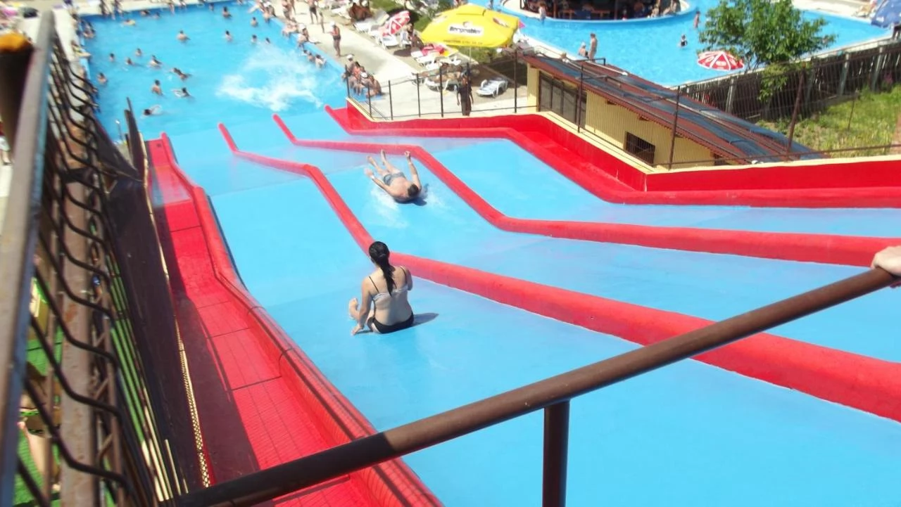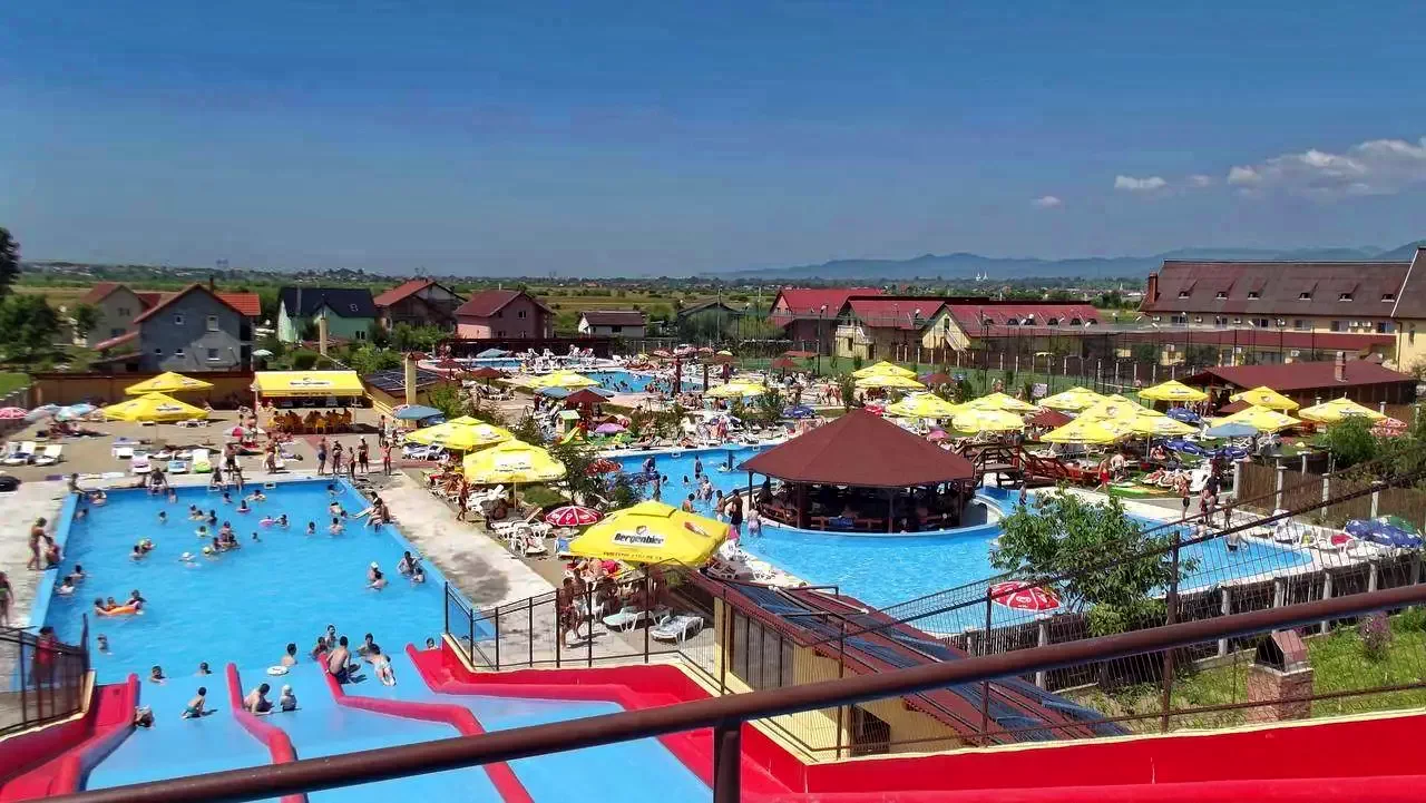 - Piscină interioară și exterioară (cu piscină pentru copii și tobogan de apă)