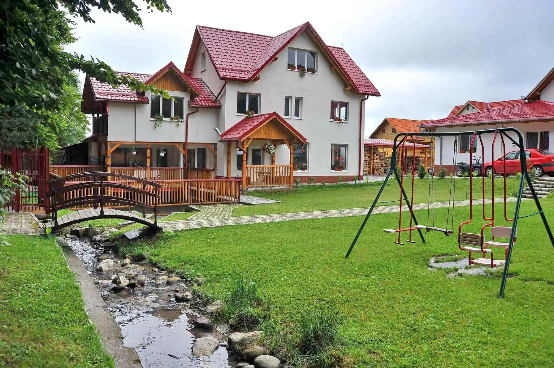 - In curtea amenajata a pensiunii se afla cuptor, grătar, ceaun, un foișor pentru 20 de persoane, loc de joaca, un lac cu păstrăvi unde se poate pescui, si parcare privata.