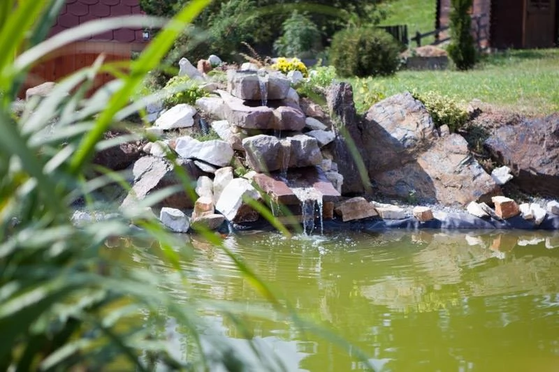 - Zone verzi cu mobilier de grădină și un mic iaz.