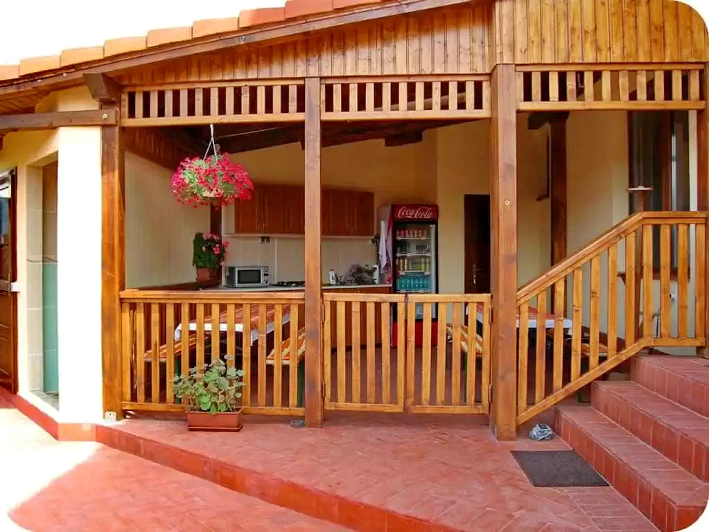 - Pe terasa pensiunii, dotată cu o bucătărie exterioară utilată, vă puteți bucura de mese în aer liber, inclusiv de grătare sau preparate la ceaun, în serile calde de vară.