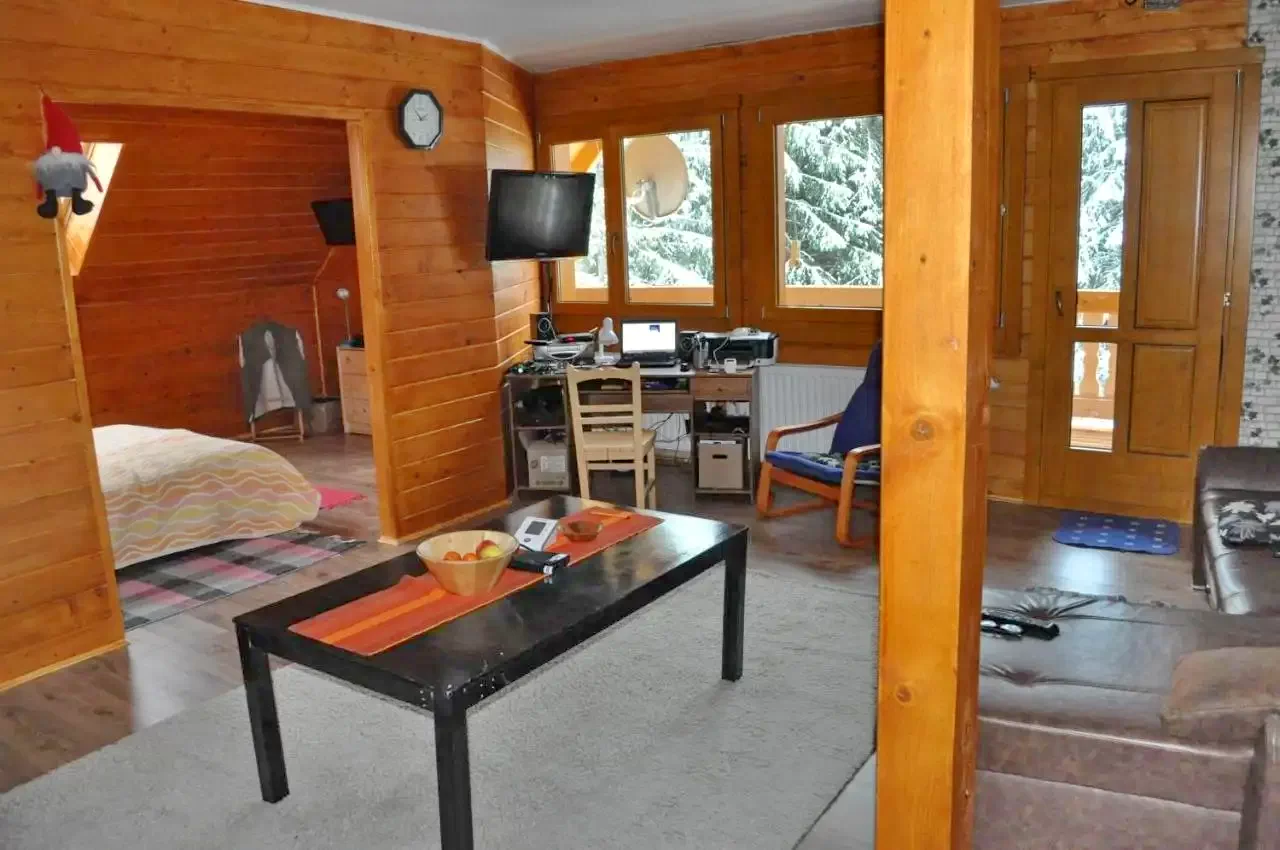 Camera 8. : Apartament cu galerie: Pat matrimonial jos si la mansarda 3 paturi simple , chicineta, terasa, baie cu dus si WC;