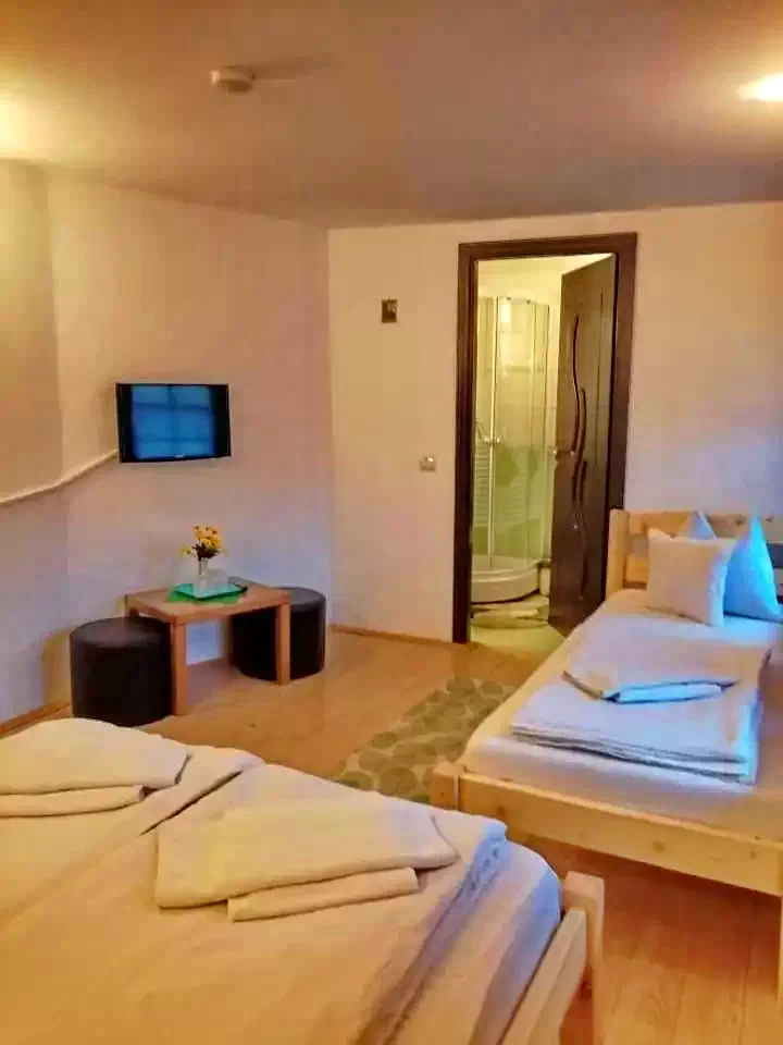 Oferim două camere de 2 persoane, două de 3 persoane și două de 4 persoane .