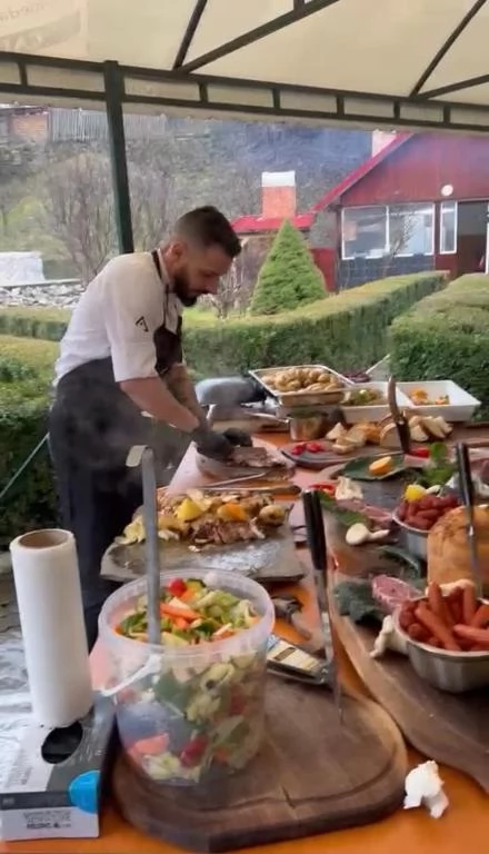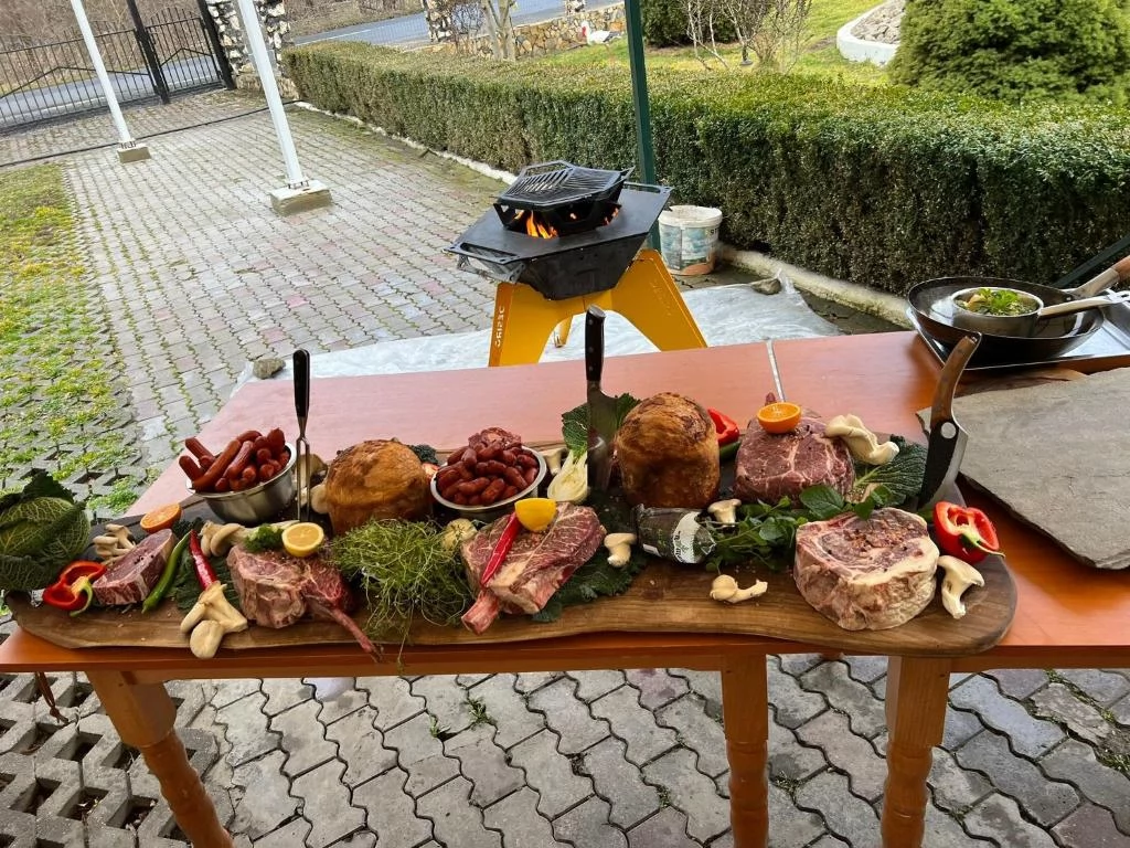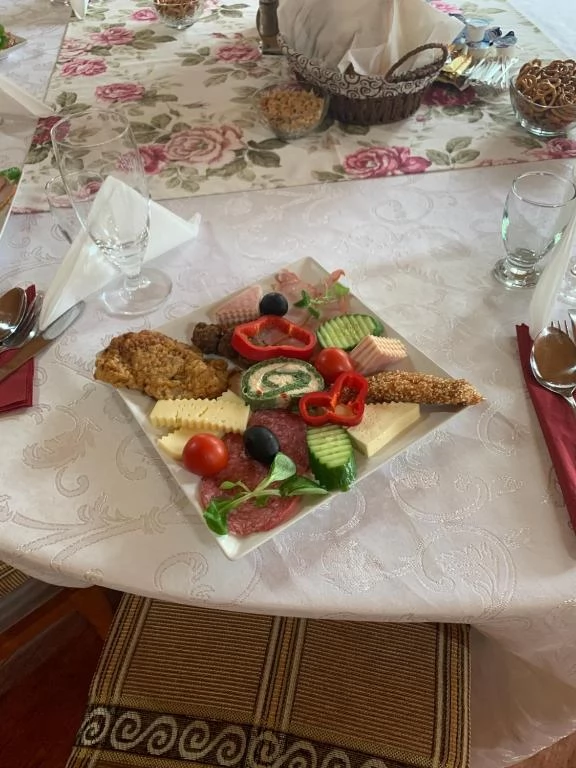Aperitive traditionale, pastrav, friptura de porc si curcan, sarmale, ciorba a la grec, prajituri de casa, fructe, alune etc.