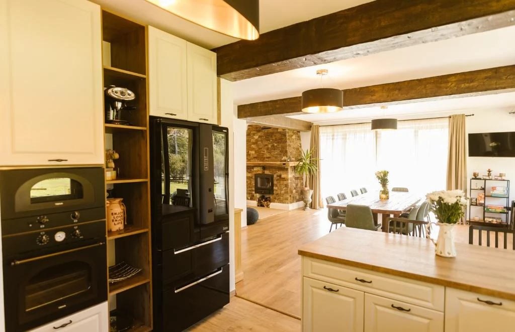 - Bucătăria este deschisă spre living și către zona de luat masa.