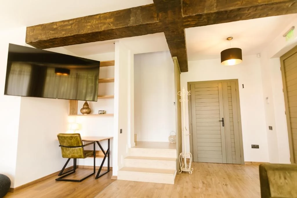 - La parter, găsiți un spațiu deschis cu un design armonios, dotat cu șemineu, care oferă un confort excelent pentru familie și prieteni.