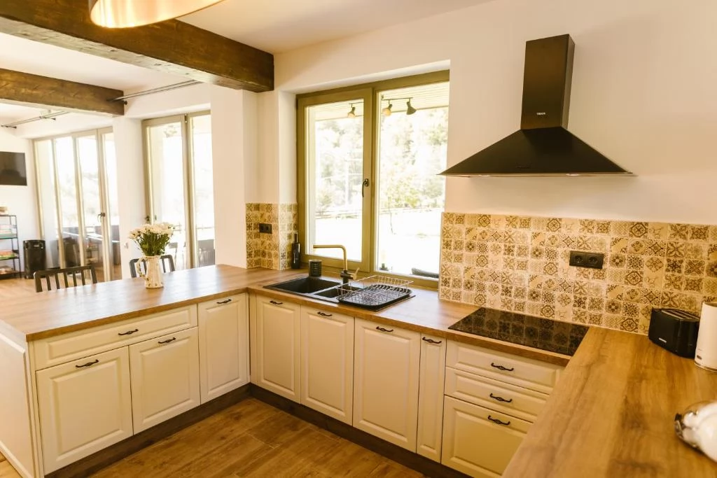 - Soluție ideală pentru iubitorii de grătar sau cei care preferă luarea mesei în aer liber: o bucătărie exterioară spațioasă.