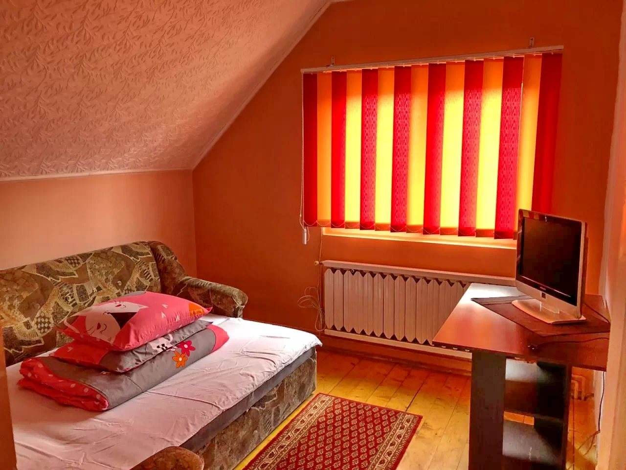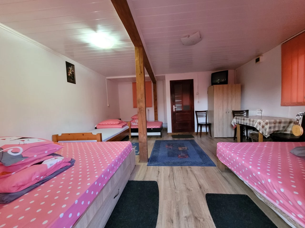 - Parter: 1 cameră cu 3 paturi duble și 1 pat suplimentar (7 persoane), TV.