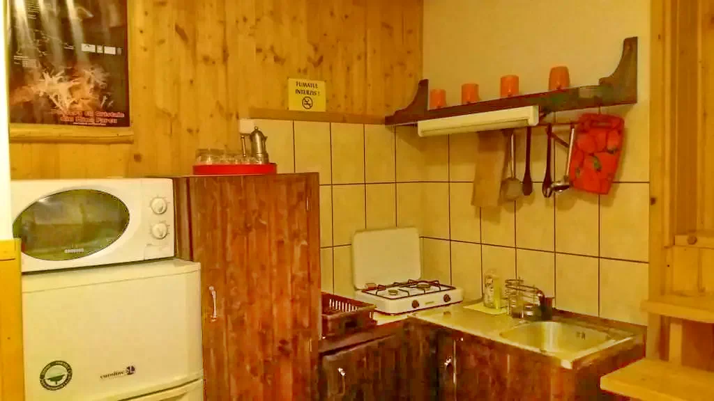 - Ofera o sufragerie si o bucătărie cu tot ce trebuie pentru gătitul şi servirea mesei (aragaz, frigider, veselă, tacâmuri, oale, cratiţe, preso cafea) situată în cadrul sufrageriei În zilele reci, plăcerea de a sta în jurul focului este asigurată de un şemineu din piatră.