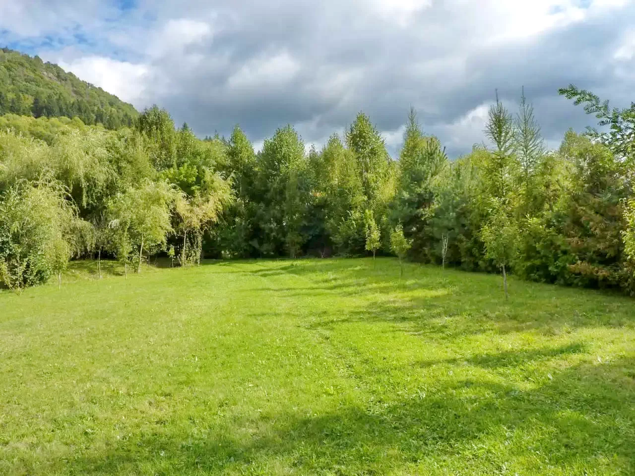 Curte de 4000 m² cu terasă, pavilion de grădină, șezlonguri și nisiparniță.