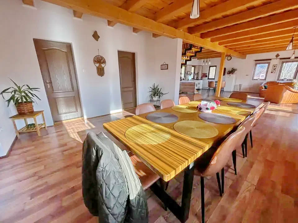 - Construcția cu un etaj include 4 camere spațioase, fiecare cu terasă privată, 2 băi, un living mare și o bucătărie complet utilată, toate concepute pentru a oferi oaspeților confort și o atmosferă primitoare.