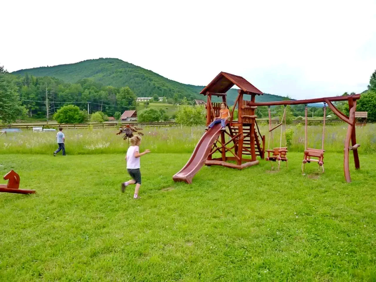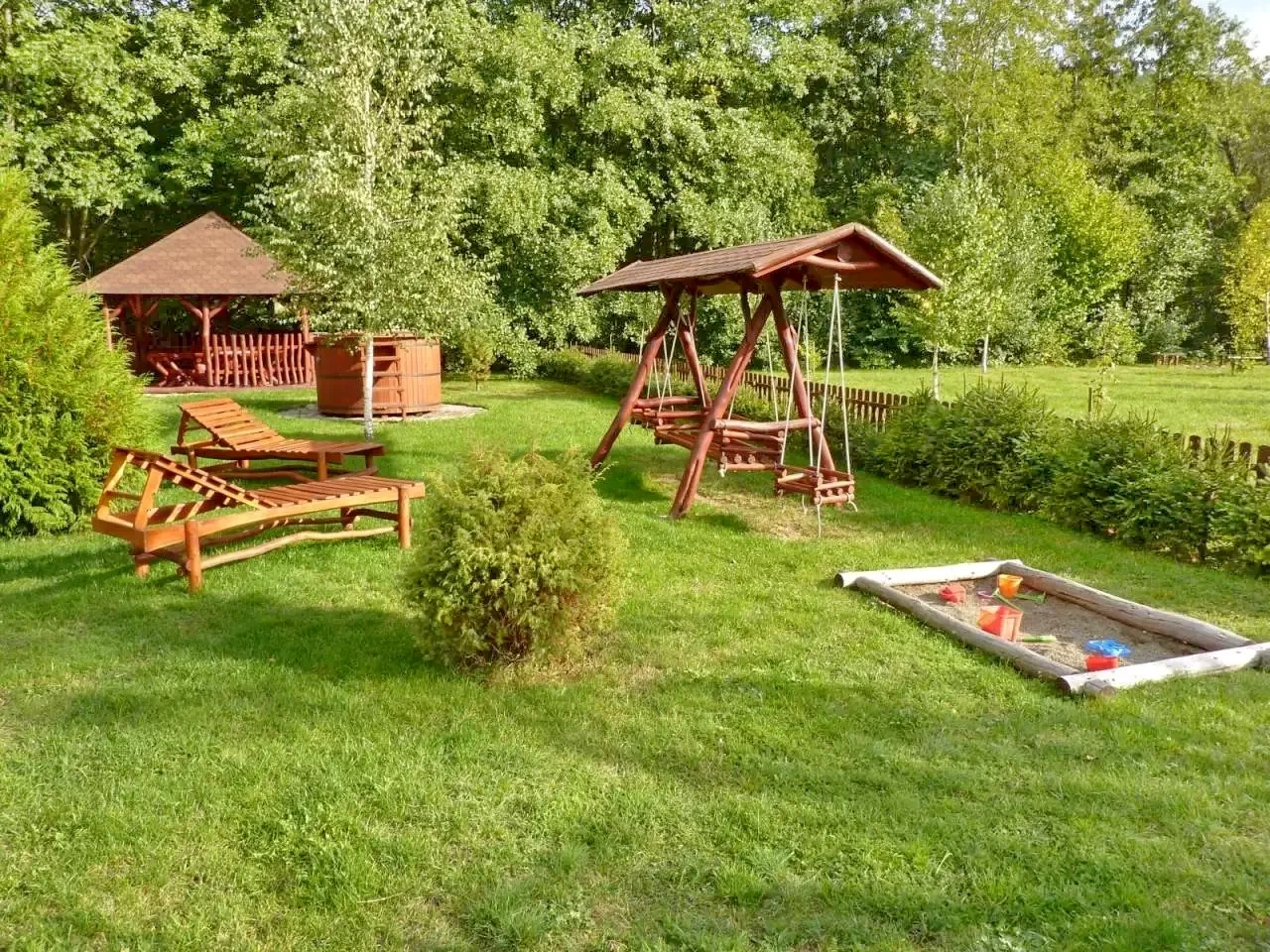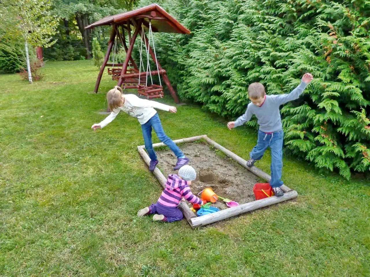 Facilități pentru copii: leagăn, tobogan, groapă cu nisip, lipinka