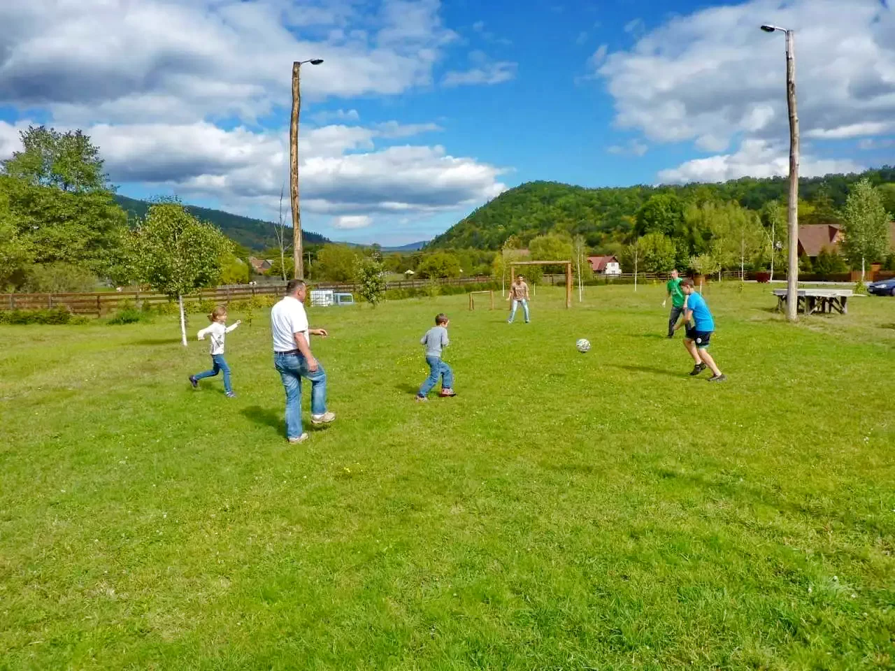 - Curtea de 500 m² este echipată cu leagăn, tobogan, groapă cu nisip, coș de baschet, masă de ping-pong și teren de fotbal, oferind distracție pentru toate vârstele.