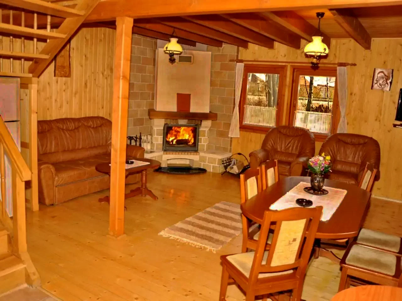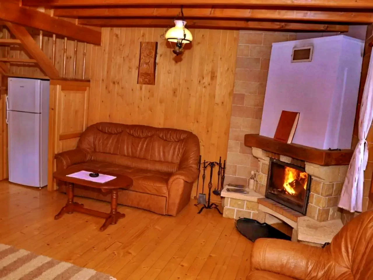 - La parter, oaspeții au la dispoziție un living confortabil cu șemineu, TV cu parabolă și WIFI, o bucătărie complet utilată și o baie cu saună.