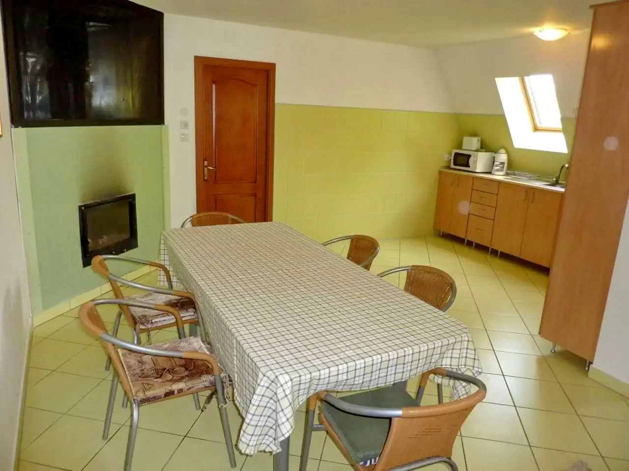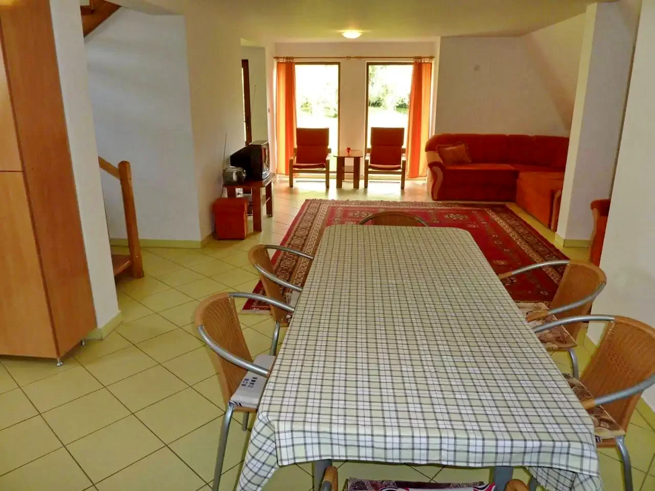 - La parter se află un living-sală de mese spațios, unde un pat extensibil poate găzdui două persoane, o bucătărie complet utilată și o baie.