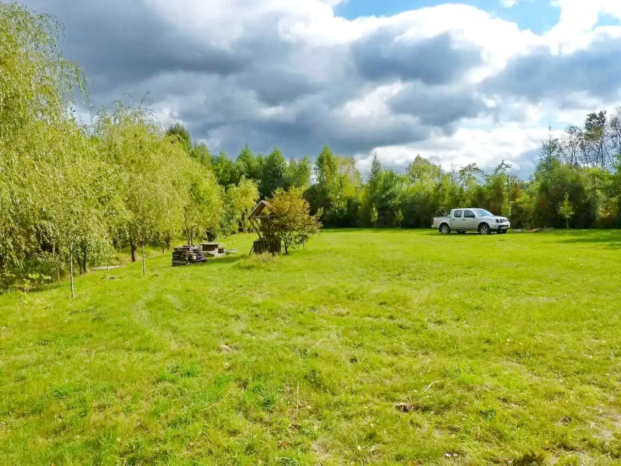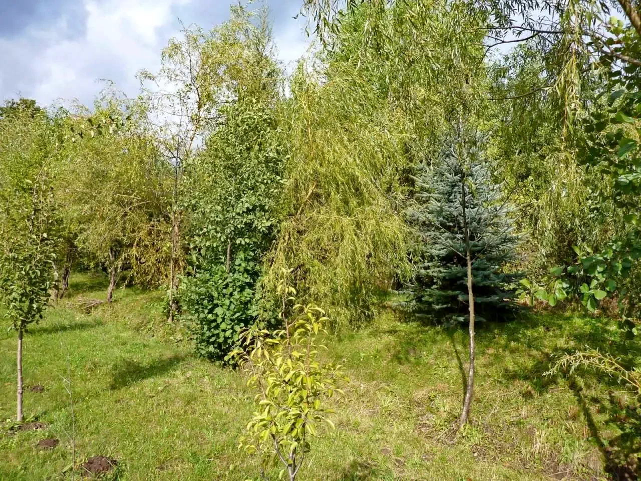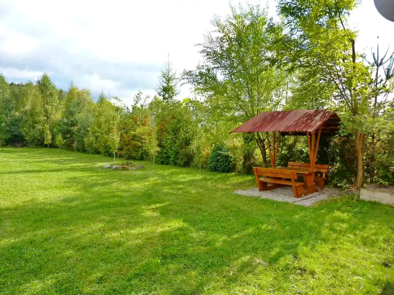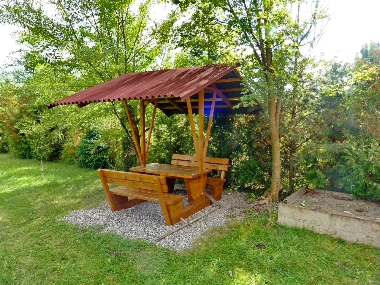 Curte de 4000 m² cu terasă, pavilion de grădină, șezlonguri și nisiparniță.
