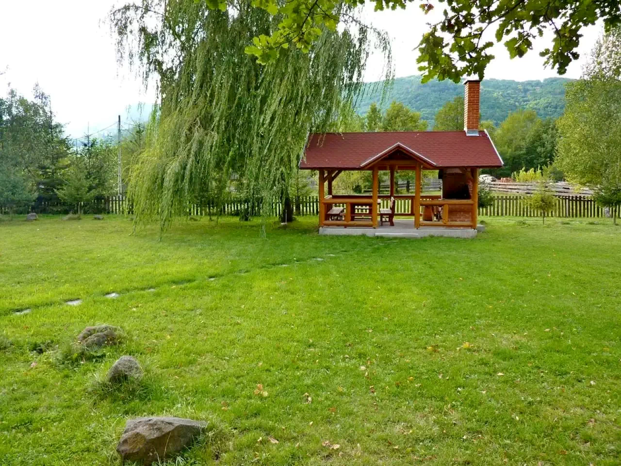 Programe în aer liber: foișorul acoperit, terasa și pavilionul de grădină sunt perfecte pentru odihnă, iar cuptorul pentru friptură, ceaunul și discul permit organizarea de mese festive în aer liber.