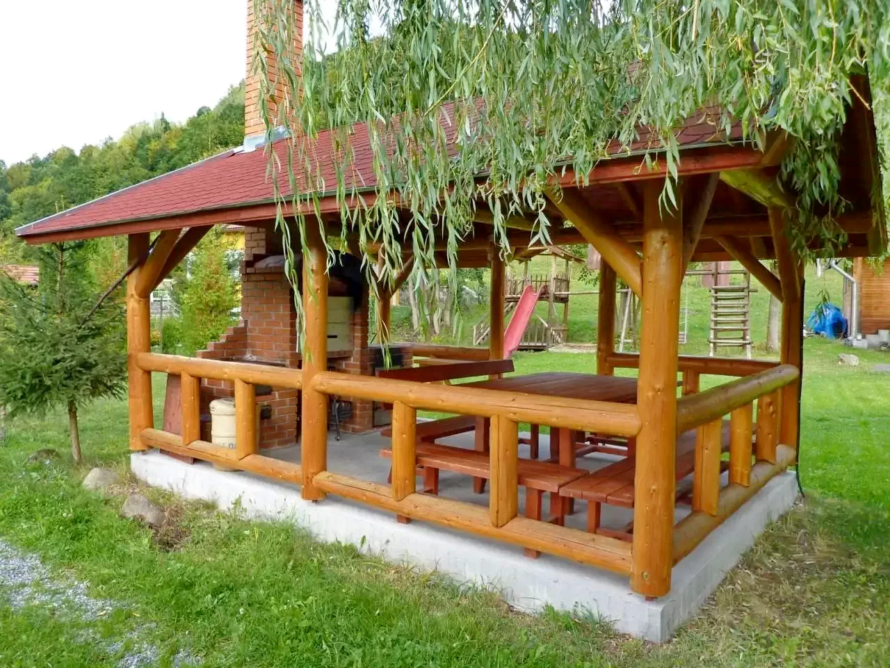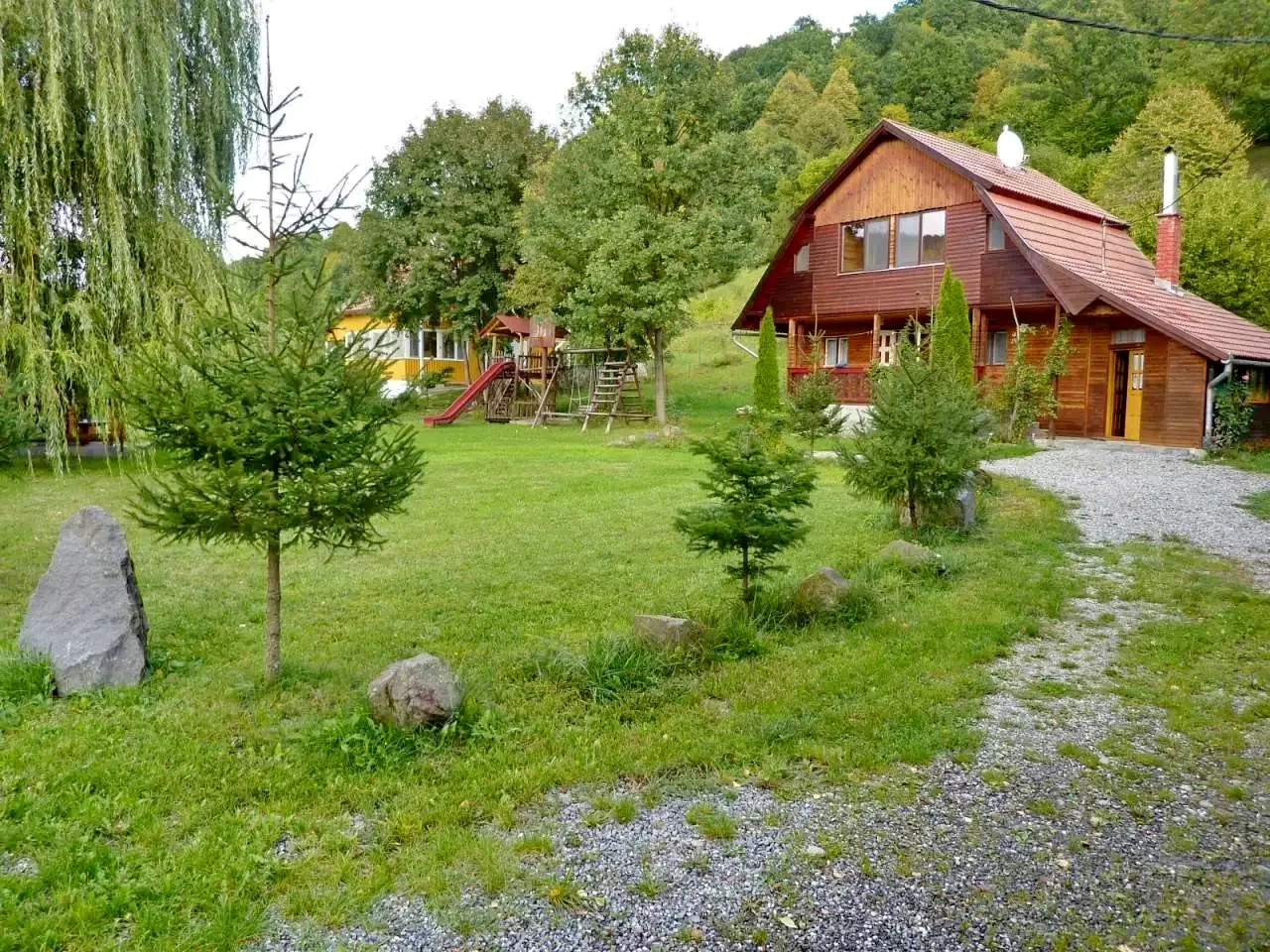 Curte de 5000 m² cu foișor acoperit, terasă, pavilion de grădină, leagăn, tobogan, cățărătoare și nisiparniță.