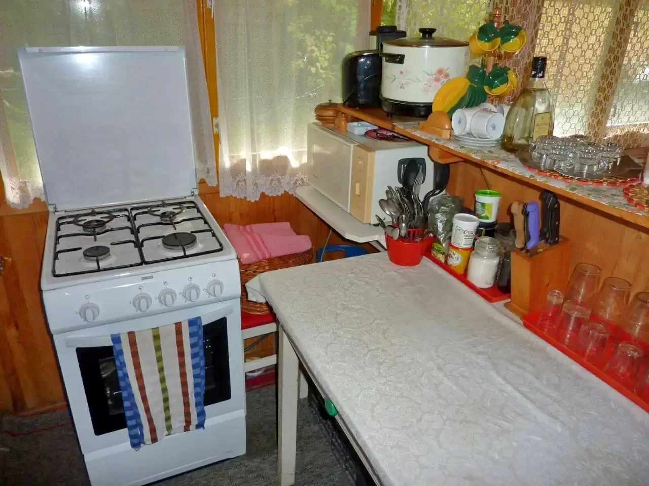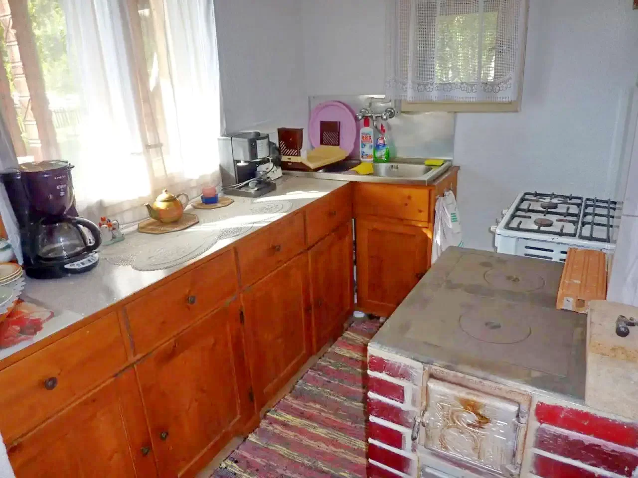 - Casa dispune de o bucătărie complet utilată la parter, cu aragaz pe gaz, frigider, cuptor cu microunde, prăjitor de pâine, filtru de cafea, fierbător de ceai, oale, tacâmuri și veselă, perfectă pentru prepararea meselor proprii.