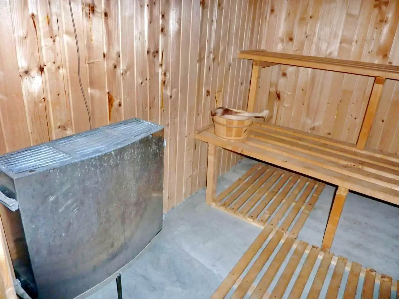 - La parter se află un living-sală de mese spațios, o bucătărie complet utilată, o baie, o saună și o cameră cu pat matrimonial.