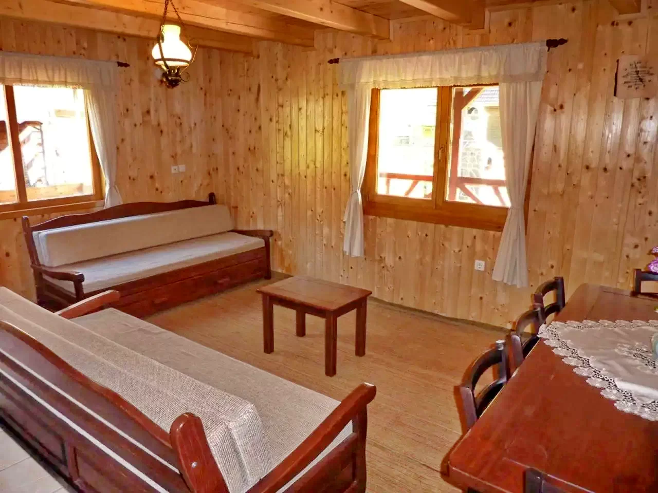 - Cabana este o locuință modernă și primitoare, cu 3 dormitoare spațioase și un pat extensibil în living, oferind o atmosferă caldă și confortabilă.