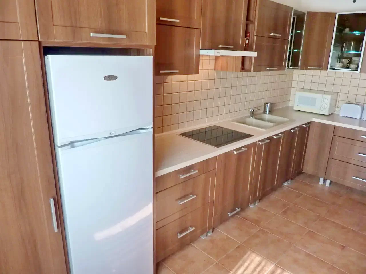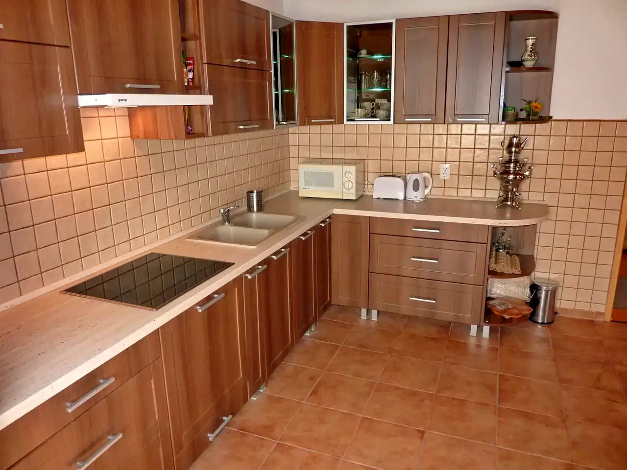 - Aceasta este echipată cu plită electrică, frigider, cuptor cu microunde, prăjitor de pâine, filtru de cafea, fierbător de ceai, precum și oale, tacâmuri și veselă.