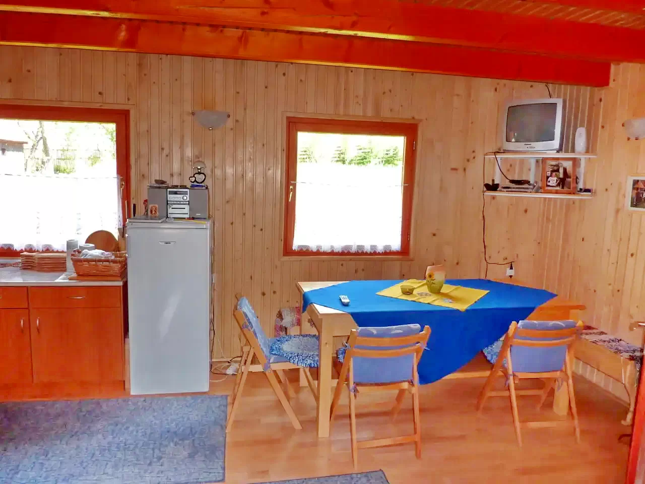- La parter se află un living-sală de mese spațios, o bucătărie complet utilată, o toaletă separată, o baie cu duș și două camere: una cu două paturi single, cealaltă cu un pat matrimonial, dotată cu televizor.