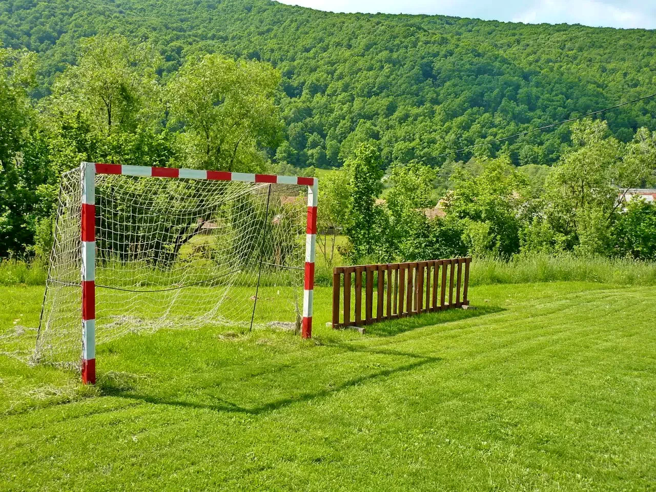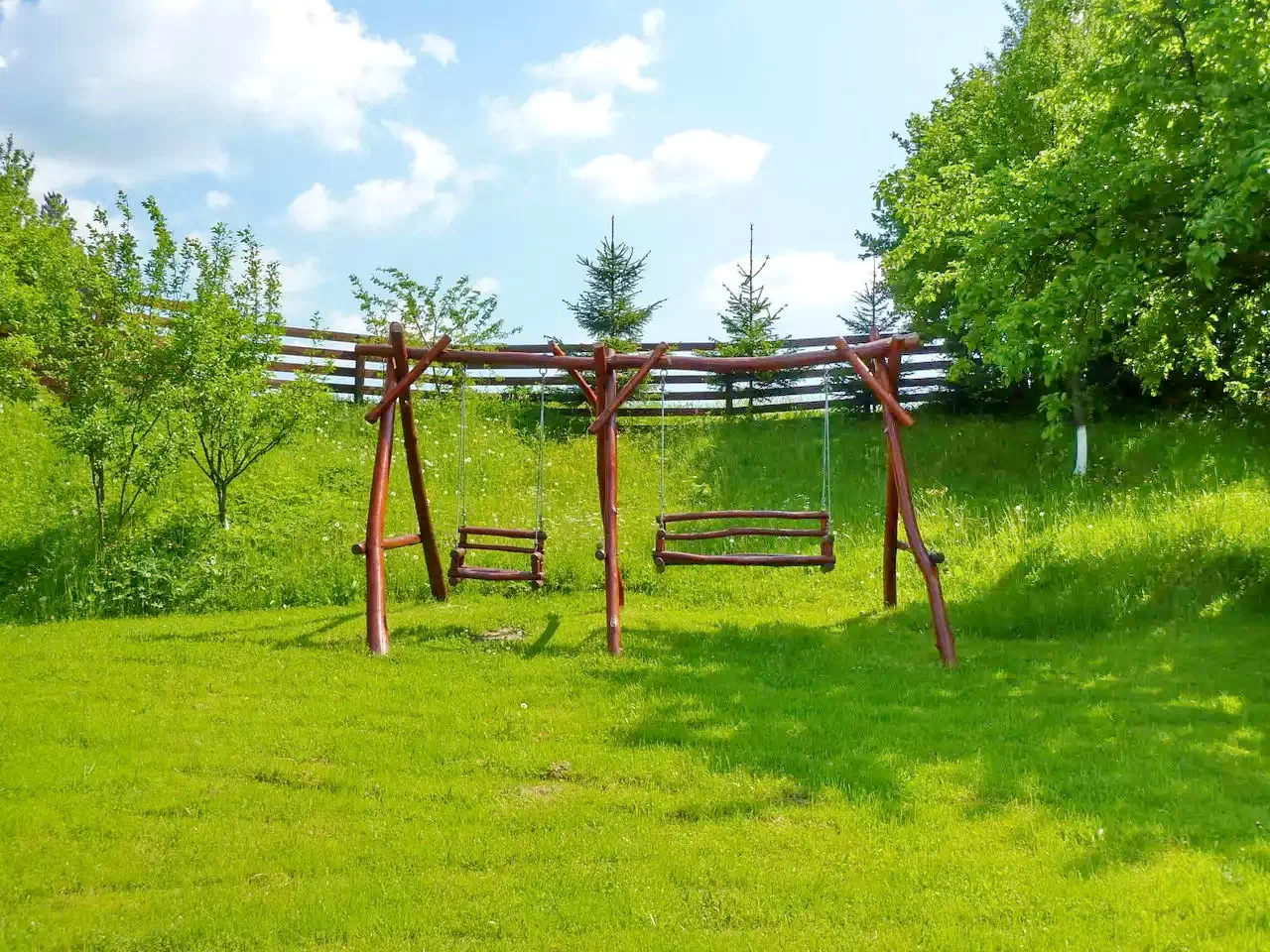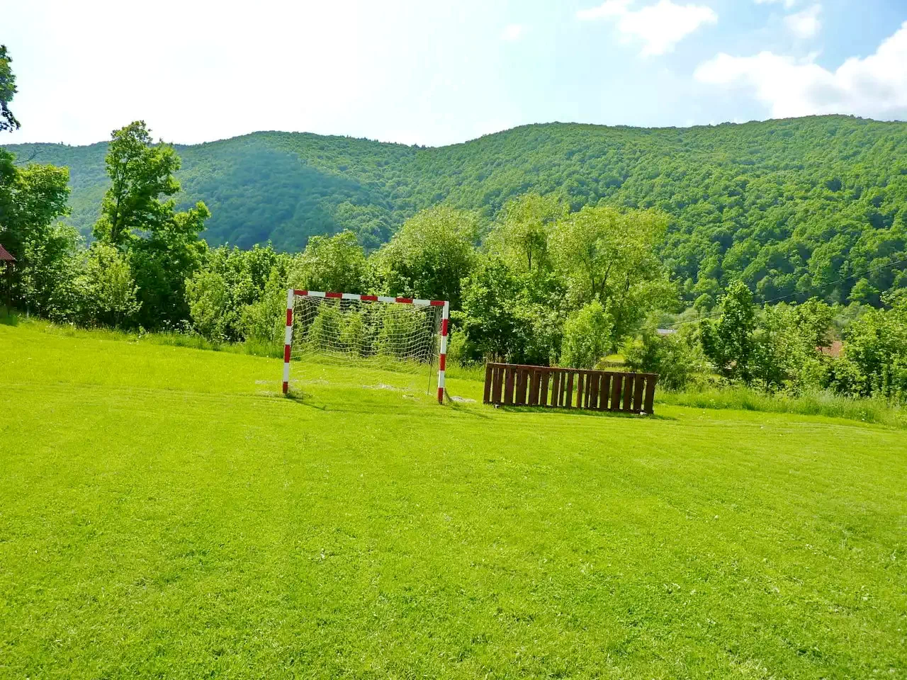Curte de 3500 m² cu terasă, pavilion de grădină, leagăn, coș de baschet și teren de fotbal.