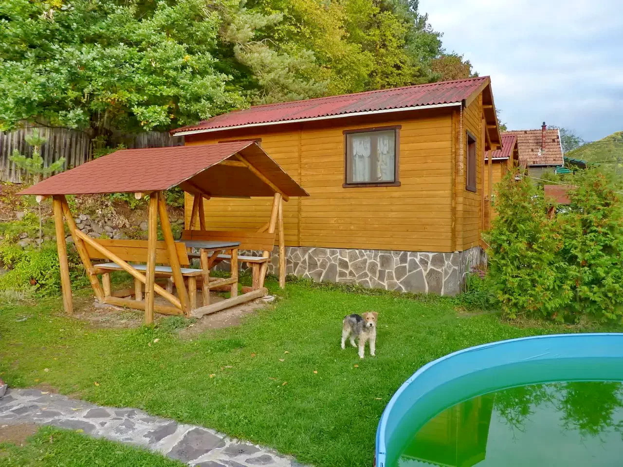 In curte sunt construite trei casute. In fiecare casuta sunt cate doua camere, dotate cu cate doua paturi simple. La nevoie, in mansarda pot fii introduse cate doua paturi de rezerva, pentru fiecare casa in parte. La parter se afla bucataria - camera de zii si baia. (In total: 3 X 4 + (3 X 2) persoane!)