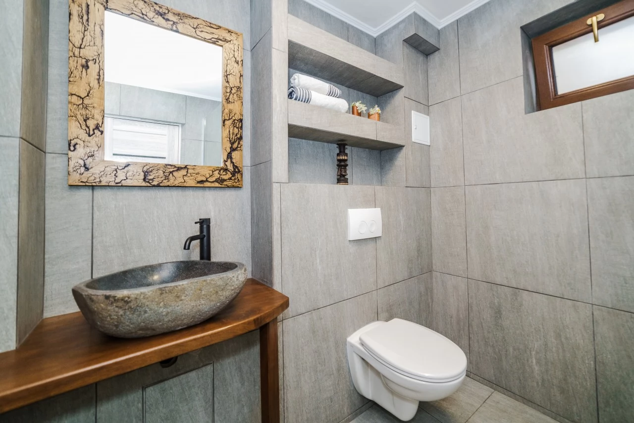 - Baia comuna cu doua dușuri si doua toalete este situata in curte, lângă cabane.