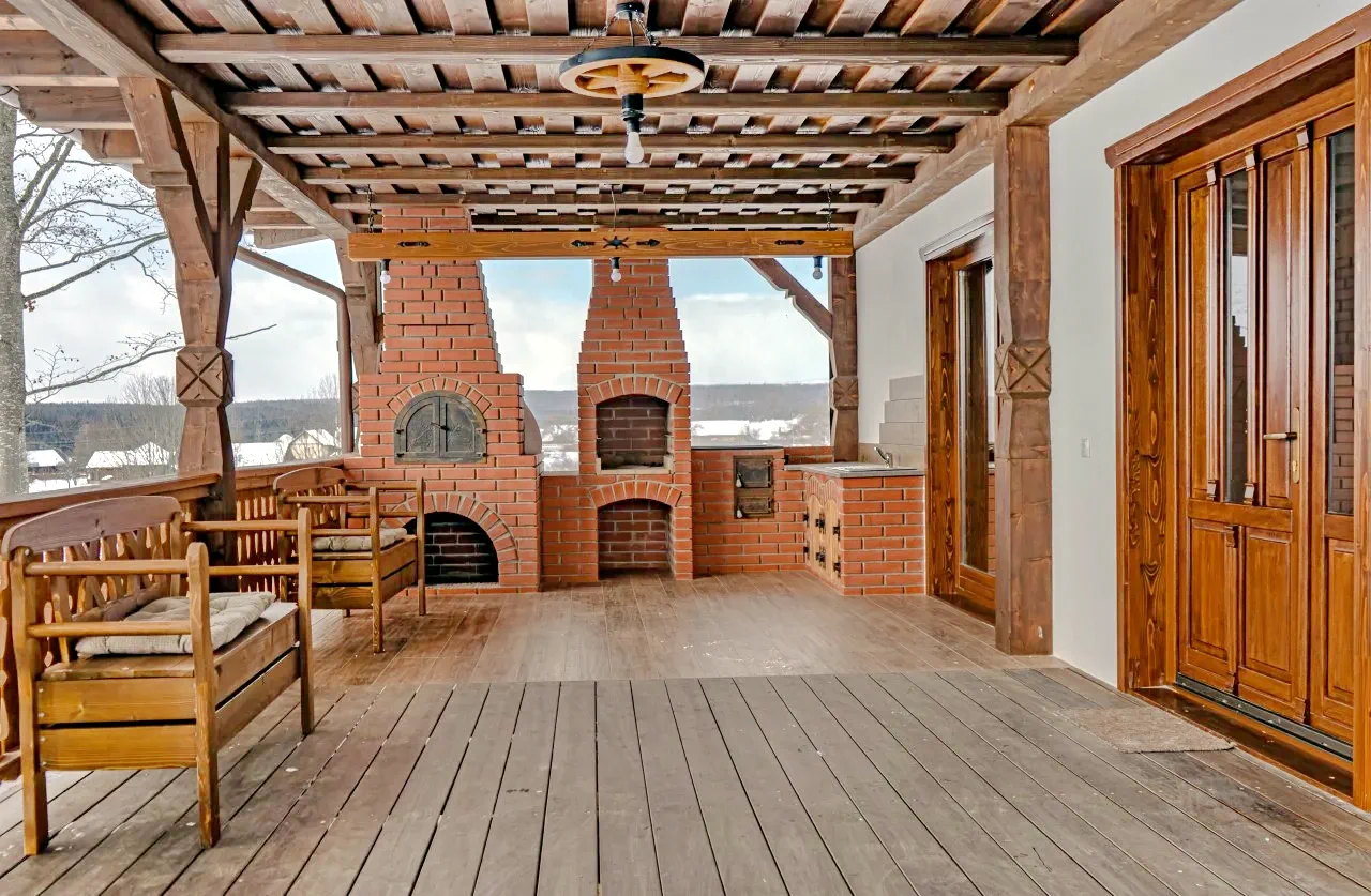 - Terasa mare acoperita al casei functioneaza ca un popas, care gazduieste un cuptor cu facilitați de grătar si ceaun.