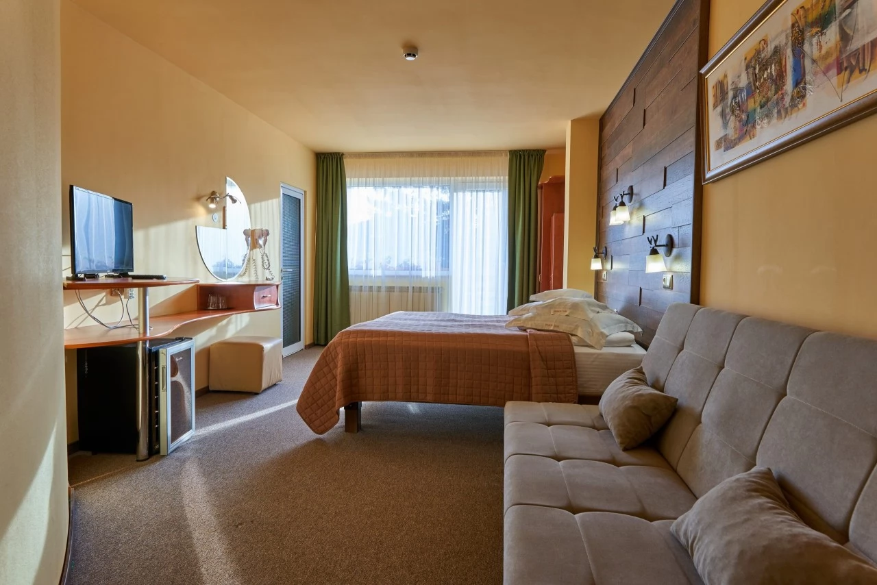 - Cele 8 camere Junior Suite au o suprafață de 24mp, situate la etajul I și II, dispun de balcon, au pat matrimonial și pat suplimentar pentru un copil, baie proprie cu cadă sau cabină de duș.