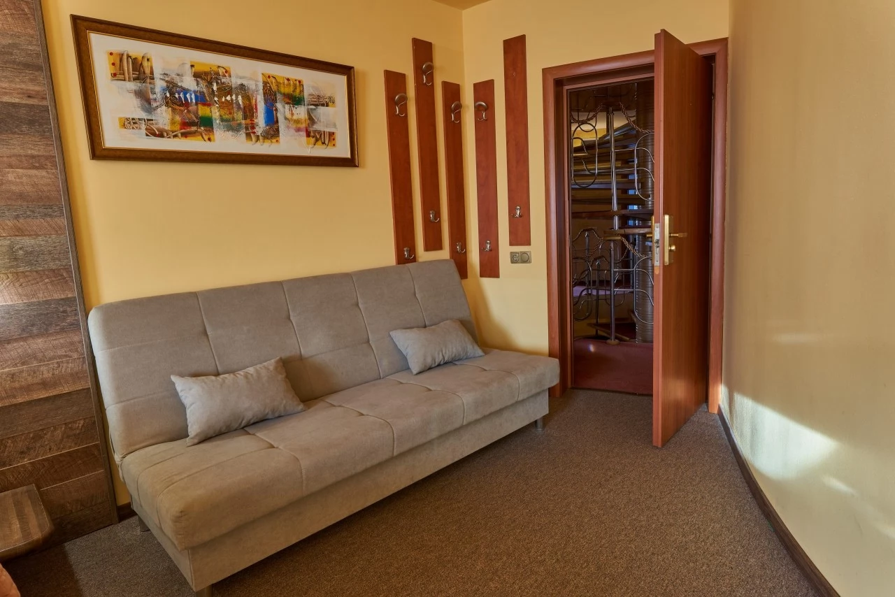 - 8 Camere JUNIOR SUITE (24 mp) cu pat matrimonial pentru doua persoane si pat suplimentar pentru un copil, cu baie proprie cu cada sau cabina de dus si balcon, situate la etajul I si II.