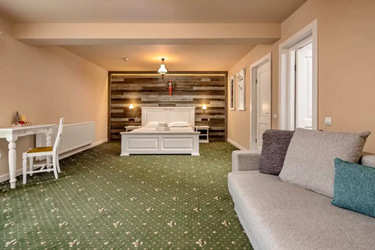 1 camera dubla superioara ( ~ 44 m² ; pat matrimonial + canapea extensibila pentru 2 persoane) cu vedere la munte - (Baia este dotata cu o cadă piscina cu hidromasaj)